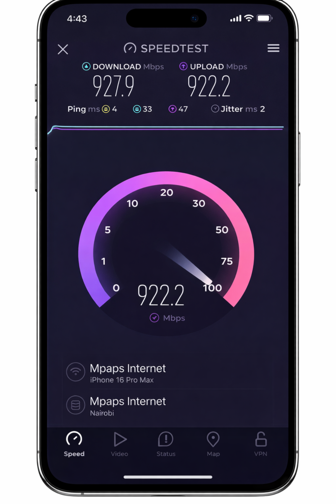 Speed matters—and so does consistency. Try us today and experience performance our clients love: fast downloads, strong upload speeds, and stable connectivity. From Nairobi to beyond, we’re building a network designed for modern life—work, entertainment, and business without buffering or delays.